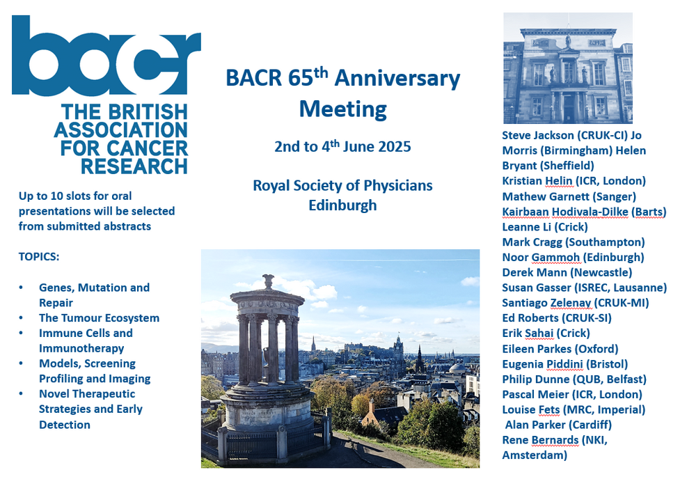 The British Association for Cancer Research (BACR) is the overarching organisation of UK’s cancer research. The Association covers all areas of cancer research from basic discovery science to clinical application, and is particularly focused on promoting and supporting early career cancer researchers. In 2025, BACR will have been actively supporting its mission for 65 years! To mark this anniversary, we are holding a special conference at the Royal College of Physicians in Edinburgh, June 2nd to 4th 2025. The purpose of the meeting is to principally bring together cancer researchers from multiple centres across the UK, which is reflected in the event’s invited speakers that include some of the UK’s established cancer researchers, a number of its rising stars as well as research leaders from outside the UK. The meeting will be focused on five main themes: ‘Genes, Mutations and Repair’, ‘The Tumour Ecosystem’, ‘Immune cells and immunotherapy’, ‘Models, screening, profiling and imaging’ and ‘Novel therapeutic strategies and early detection’. The programme will also include a number of short talks chosen from submitted abstracts, two poster sessions, a trade exhibition, lots of networking opportunities and a conference dinner with traditional Scottish ceilidh. Discounted attendance will be available for BACR Members, Students and Early-Bird registrations.