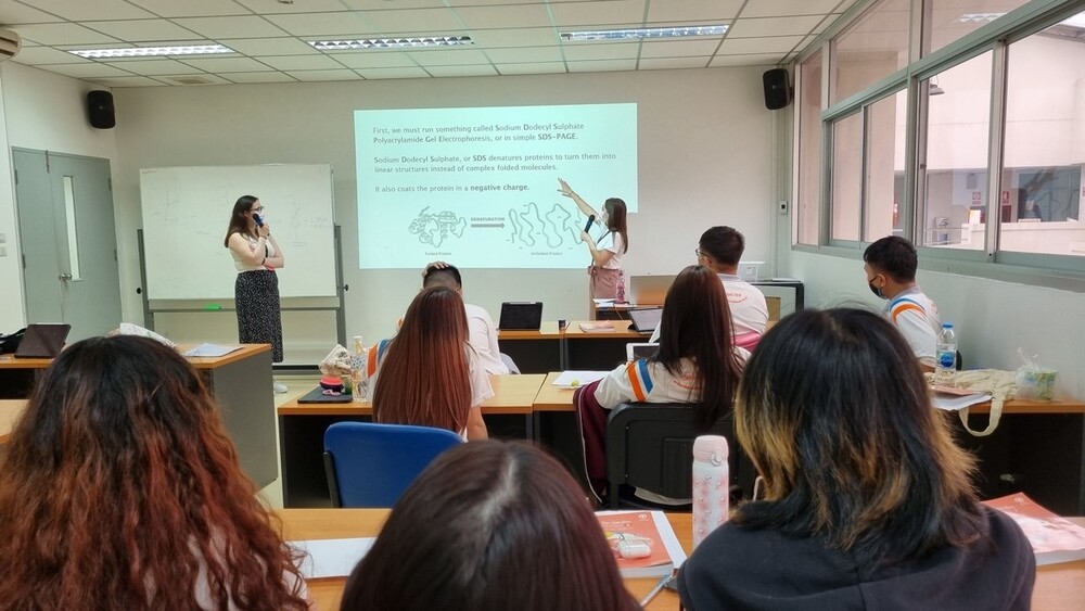 I also spent one-month visiting biotechnology institutions in Thailand, to engage with the industrial side of research. Within the Virology and Cell Technology Laboratory (AVCT) at the National Center for Genetic Engineering and Biotechnology (BIOTEC), I recombinantly produced and purified viral proteins to be used in a multi-pathogen detection kit. Additionally, I spent a week at the Bioprocess Research and Innovation Center (BRIC) at King Mongkut’s University of Technology Thonburi (KMUTT) to work on cell cultivation analytics for bioprocessing improvement. Following completion of my placement, it was an honour to be re-invited back to Thailand to present a poster for a press conference and showcase at the Ministry of Higher Education. However, I knew that if I was to return to Thailand, I needed to give knowledge to the community - just as they did for me. After the green-light from the KMUTT principal and a £500 award from the SoCoBio Flexible Supplement Fund, I designed and delivered two 3-hour workshops for 15–16 year-old science-engineering students. The workshop detailed higher education in the UK, routes within academia and an end focus on biotechnology advancements in Thailand. Students designed their own biotechnology companies and analysed SDS-PAGE and Western Blots to determine the “culprit” that had spread a viral zombie outbreak in London. With students whom would “strongly consider” a future career in science increasing from 25.0% to 59.7% following the workshop.