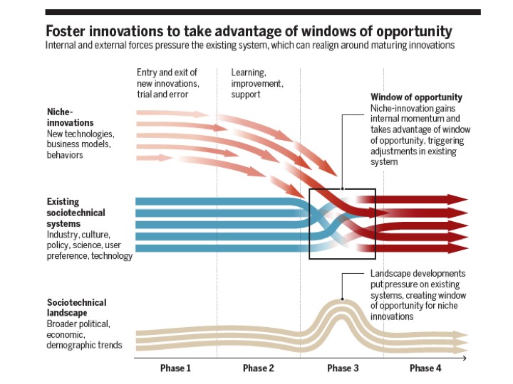 Figure 1. A model of the progress of change to existing socio-technical systems. From: Geels, F. W. et al (2017) Science 357: 1242-1244 (with permission and with thanks to Fred Steward).